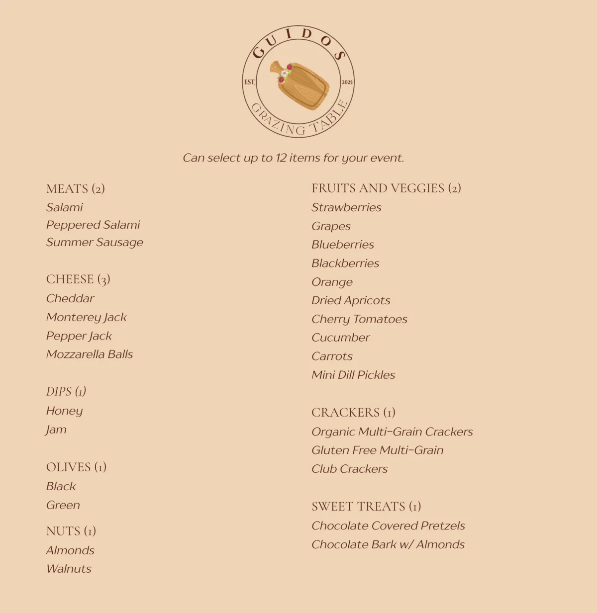 It’s a two-hour interactive grazing experience where your guests build and customize their own mini charcuterie boards. They can return for refills as many times as they’d like during the event.